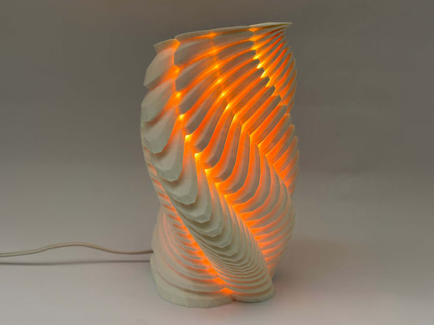 The idea for this lamp was not based on any tangible reference, instead stemming from the question, is this really possible to 3D-print? Lohman continually asked himself this question before making any design choices. When he overcame difficult steps in the process, he created new ones to make this lamp as time consuming, treacherous, and costly as he possibly could. This table lamp was designed through an iterative critiquing process with tweaks and re-tweaks being made weekly for multiple months. The final design is 3D-printed in ABS plastic with a varying width of wall thicknesses to achieve the desired glowing effect.
